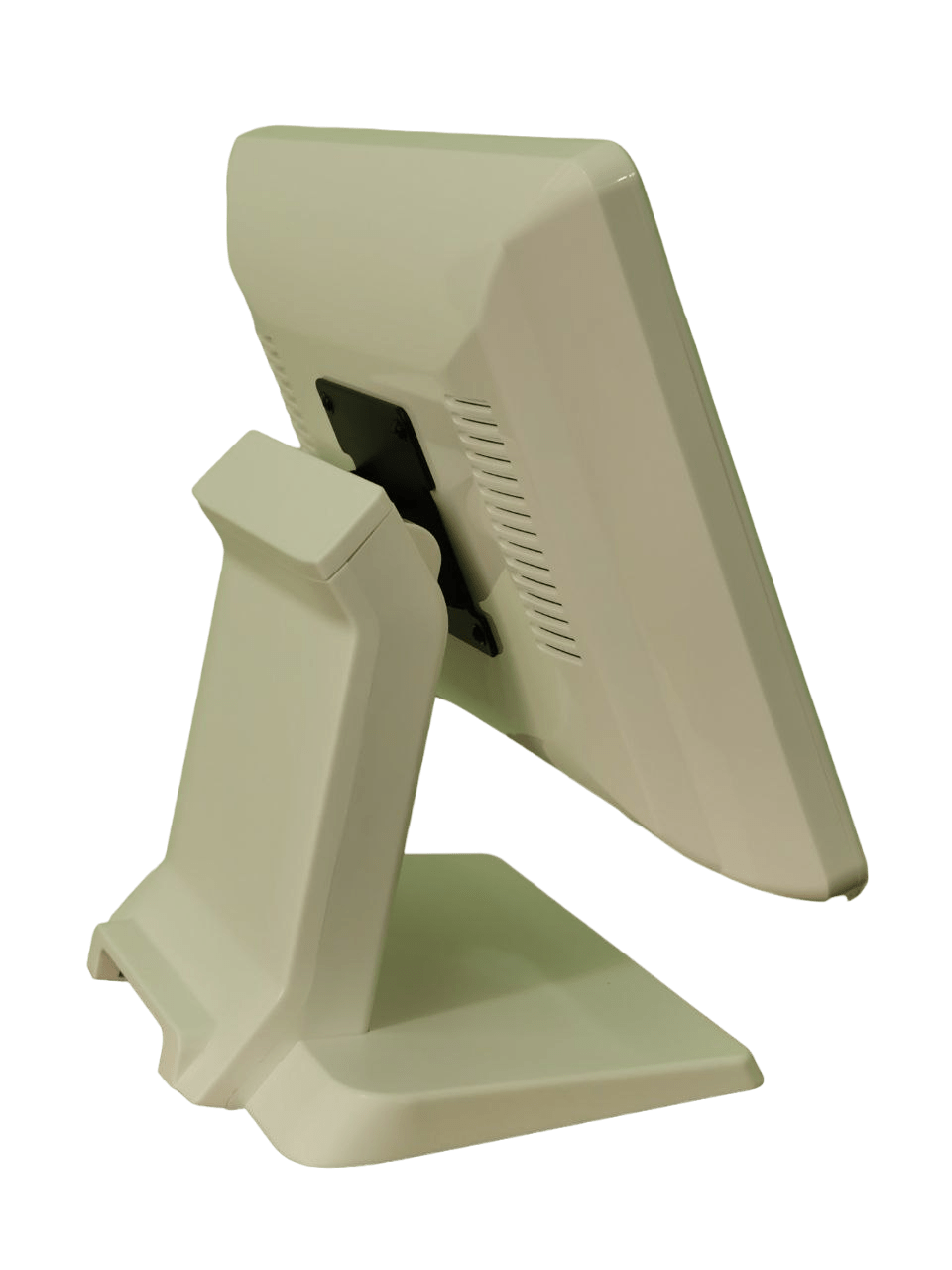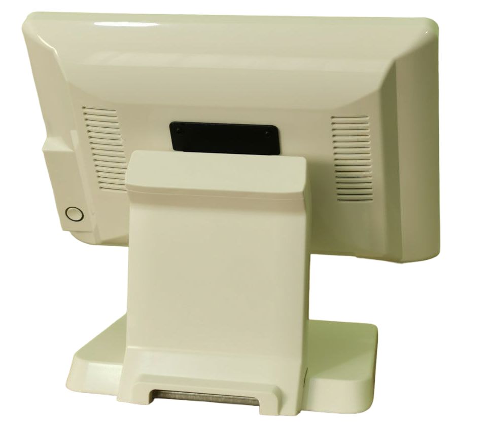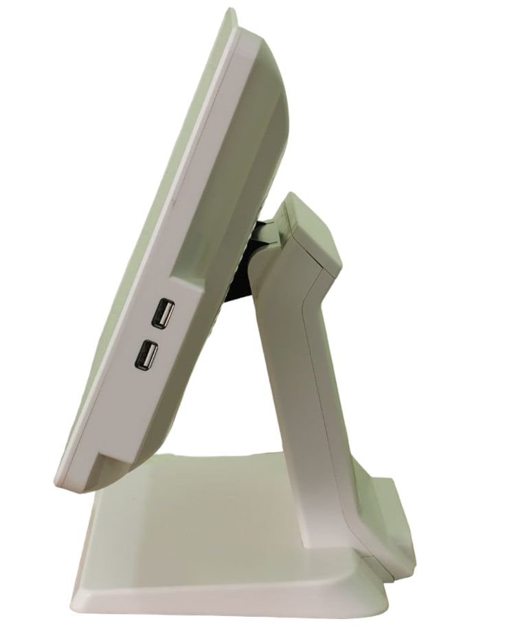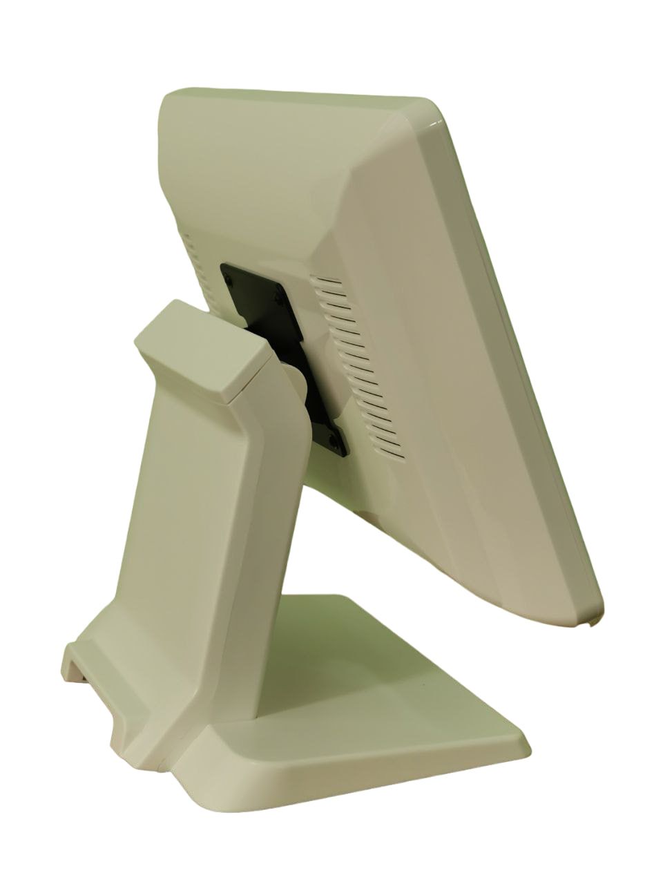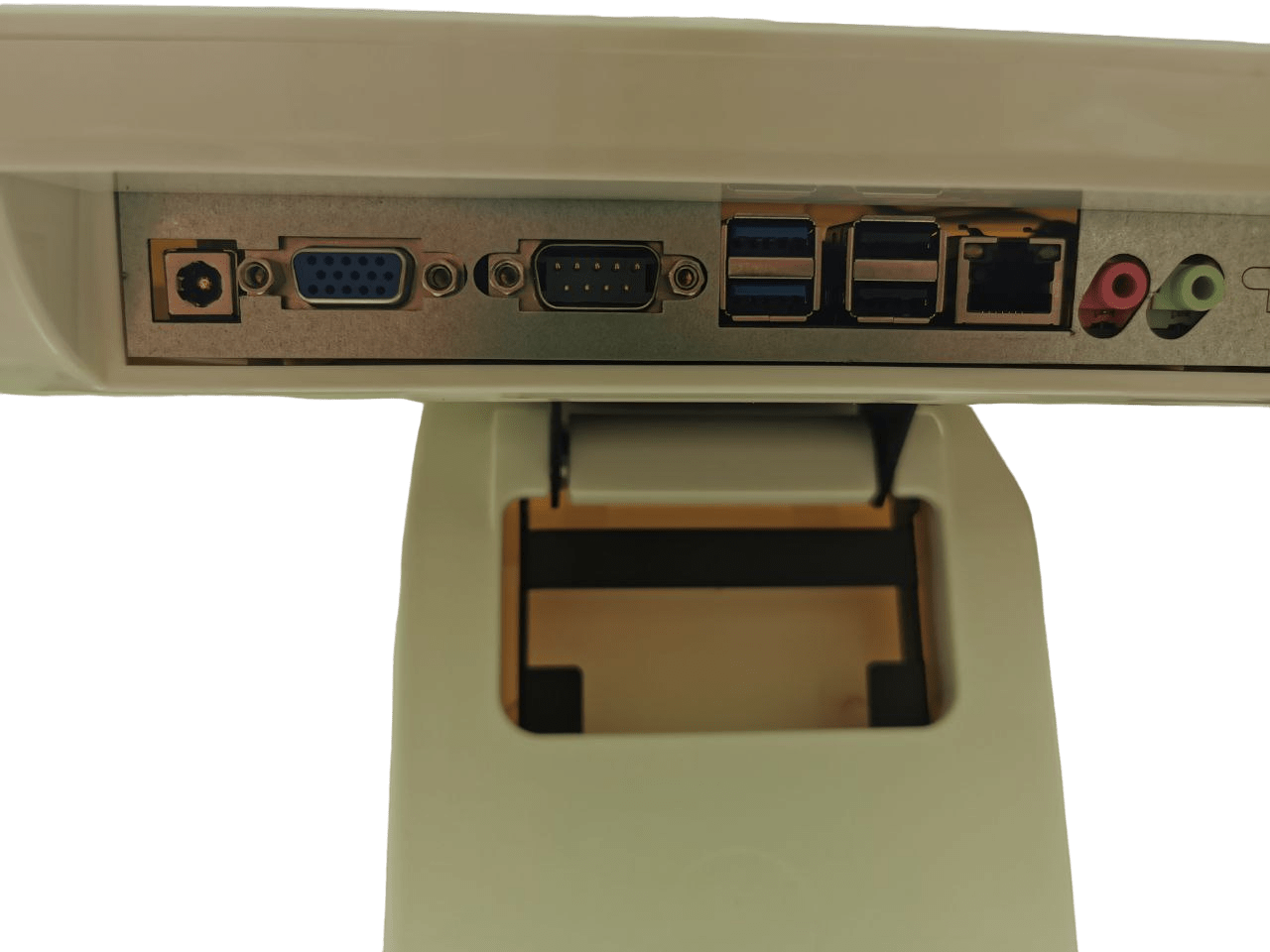 Разработчиком реализована возможность регулировки вертикального угла наклона дисплея, а на правую нижнюю часть выведены два порта USB, что позволяет оперативно подключать носитель информации и клавиатуру для установки ОС и настройки программного обеспечения. Питание терминала осуществляется от внешнего БП. Все разъёмы подключения и материнская плата размещены в нижней части корпуса (подставка устройства), кнопка включения и индикация питания совмещены и расположены на креплении экрана терминала, что существенно минимизирует случайное выключение устройства.