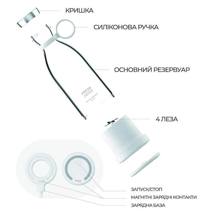 Портативний блендер Fresh Juice є революційною технологією, яка дозволяє вам робити свіжі смузі, коктейлі або змішані напої, де б ви не знаходилися.